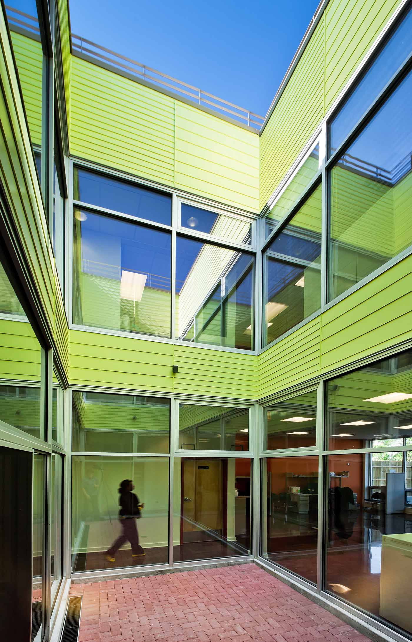 Keeping the user’s needs in mind, the office building incorporates daylight via all glass storefronts on two sides as well as a generous light well courtyard in the middle of the building; low flow plumbing fixtures, energy efficient windows and storefronts, R-21 insulated exterior walls, R-30 continuous roof insulation, energy efficient lighting fixtures low VOC products, sealants, and adhesives, and high efficiency mechanical systems.