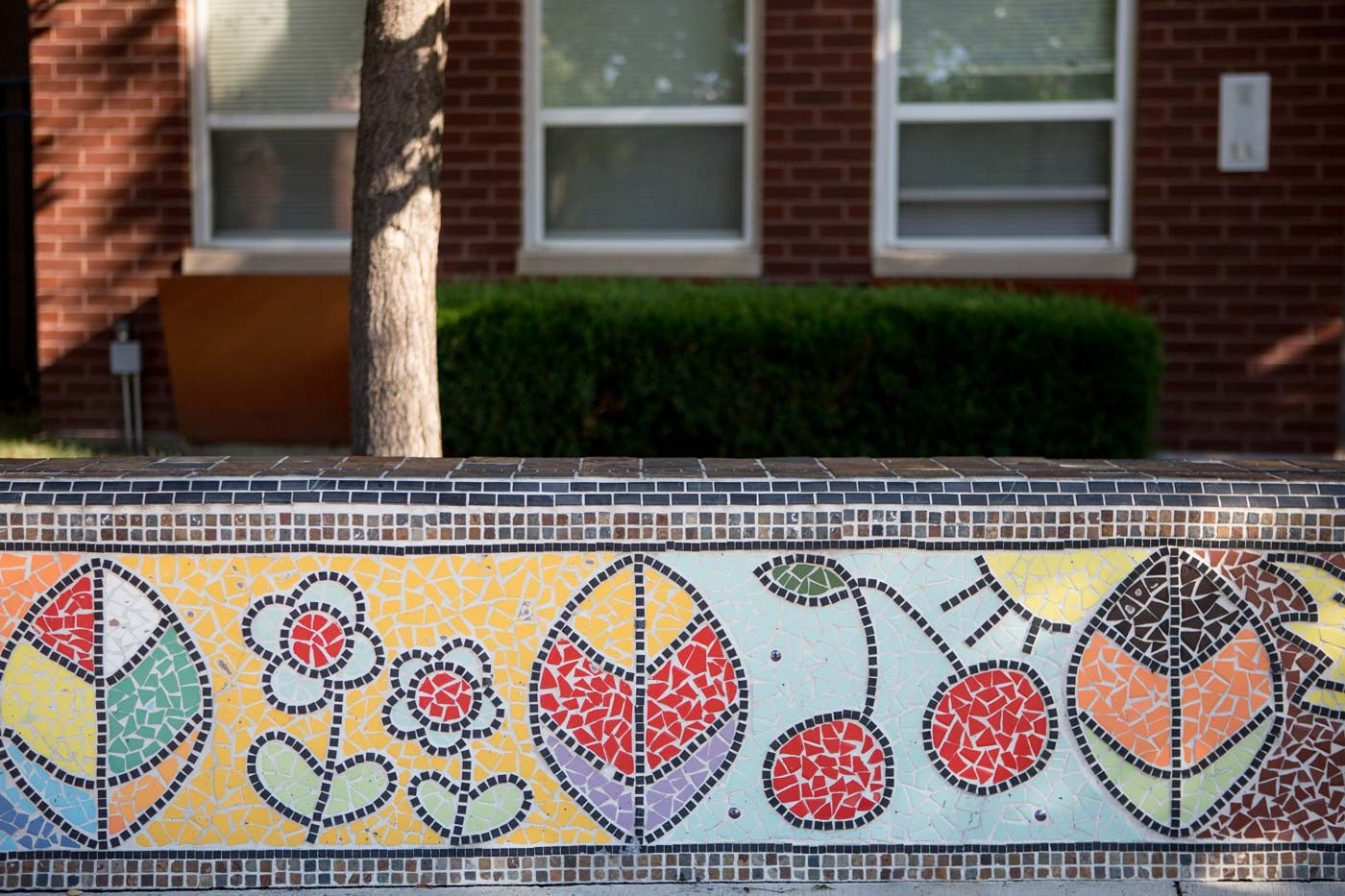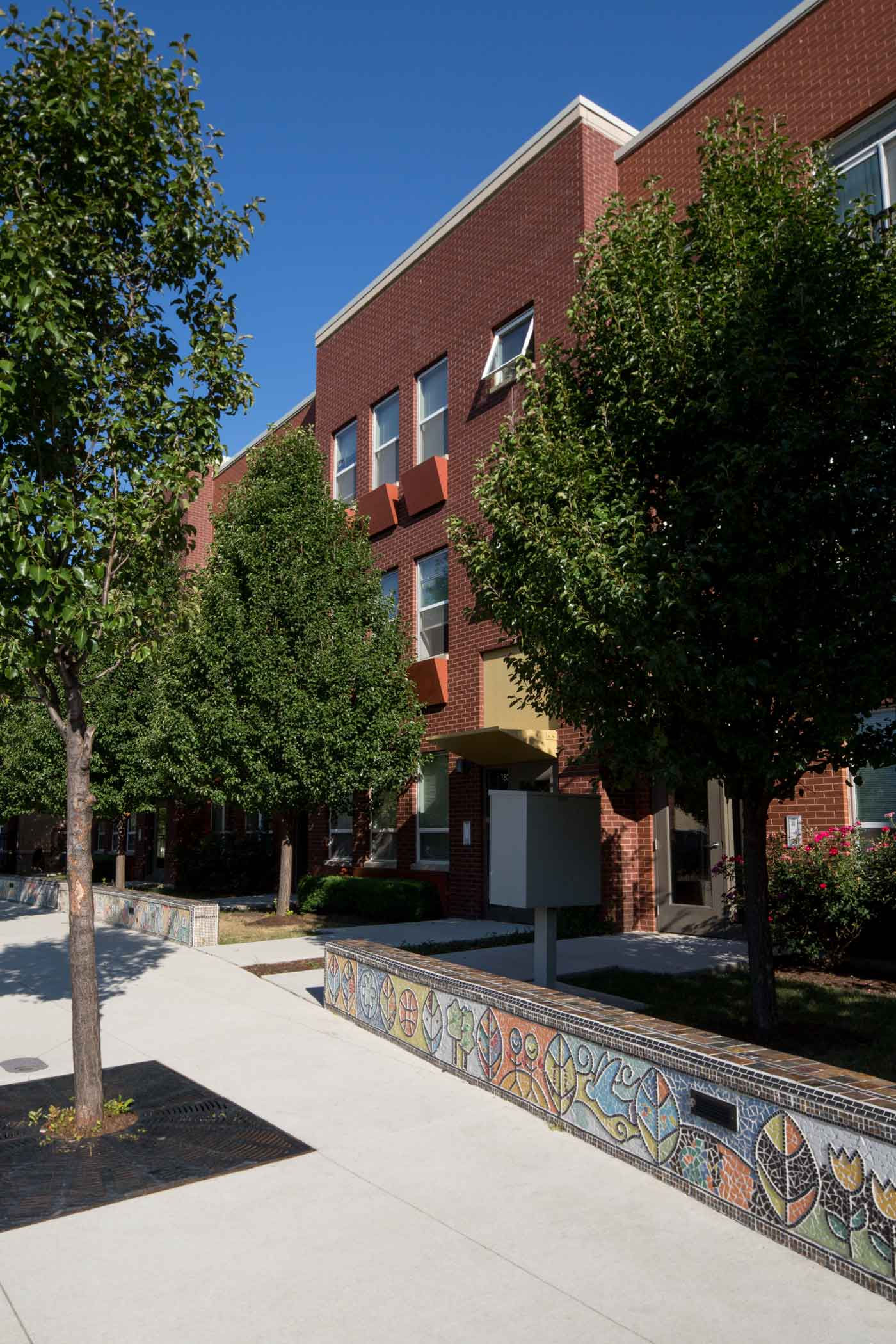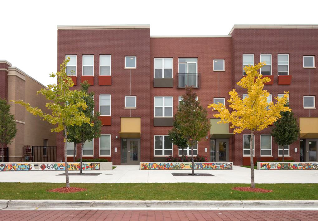 The development is centered around a public space featuring wide sidewalks, enhanced landscaping and a long bench and art wall with a community art project lead by Archi-Treasures. The development was the first project of its type to participate in the Chicago Green Permit Program and features Energy Star certified buildings with high performance building envelope, high efficiency equipment and appliances, innovative storm water management strategies, and green roofs.